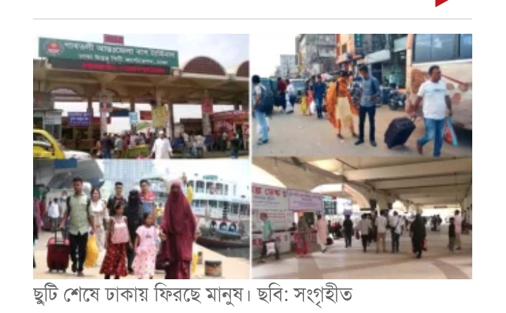 সরেজমিনে রাজধানীর বিভিন্ন বাস, ট্রেন ও লঞ্চ টার্মিনাল ঘুরে দেখা গেছে, ঈদ আনন্দ ভাগাভাগি করতে গ্রামে গিয়েছিলেন হাজারও কর্মজীবী মানুষ। ছুটি শেষে আবারও তারা কর্মস্থল ঢাকায় ফিরতে শুরু করেছেন। এ কারণে দেশের সড়ক-মহাসড়ক, নৌ-বন্দরসহ অন্যান্য টার্মিনালে রাজধানীমুখী মানুষের চাপ দেখা গেছে।